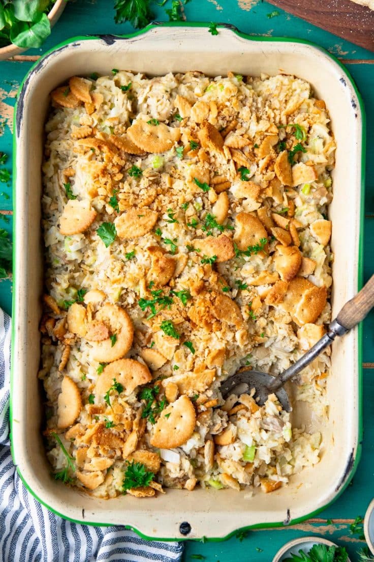 - In a separate bowl, stir together Ritz cracker crumbs and melted butter. Sprinkle over top of the casserole.